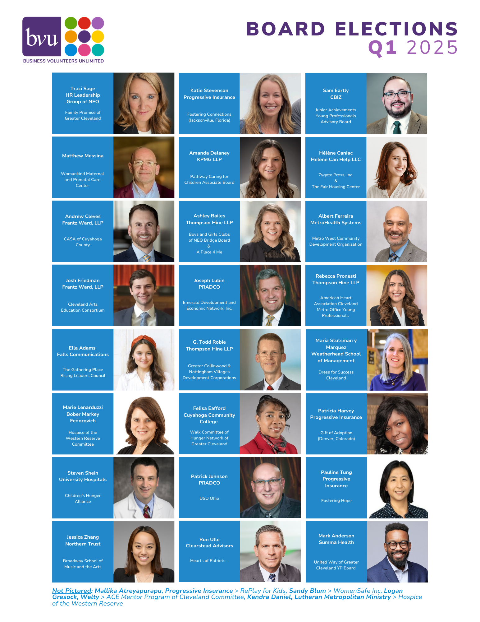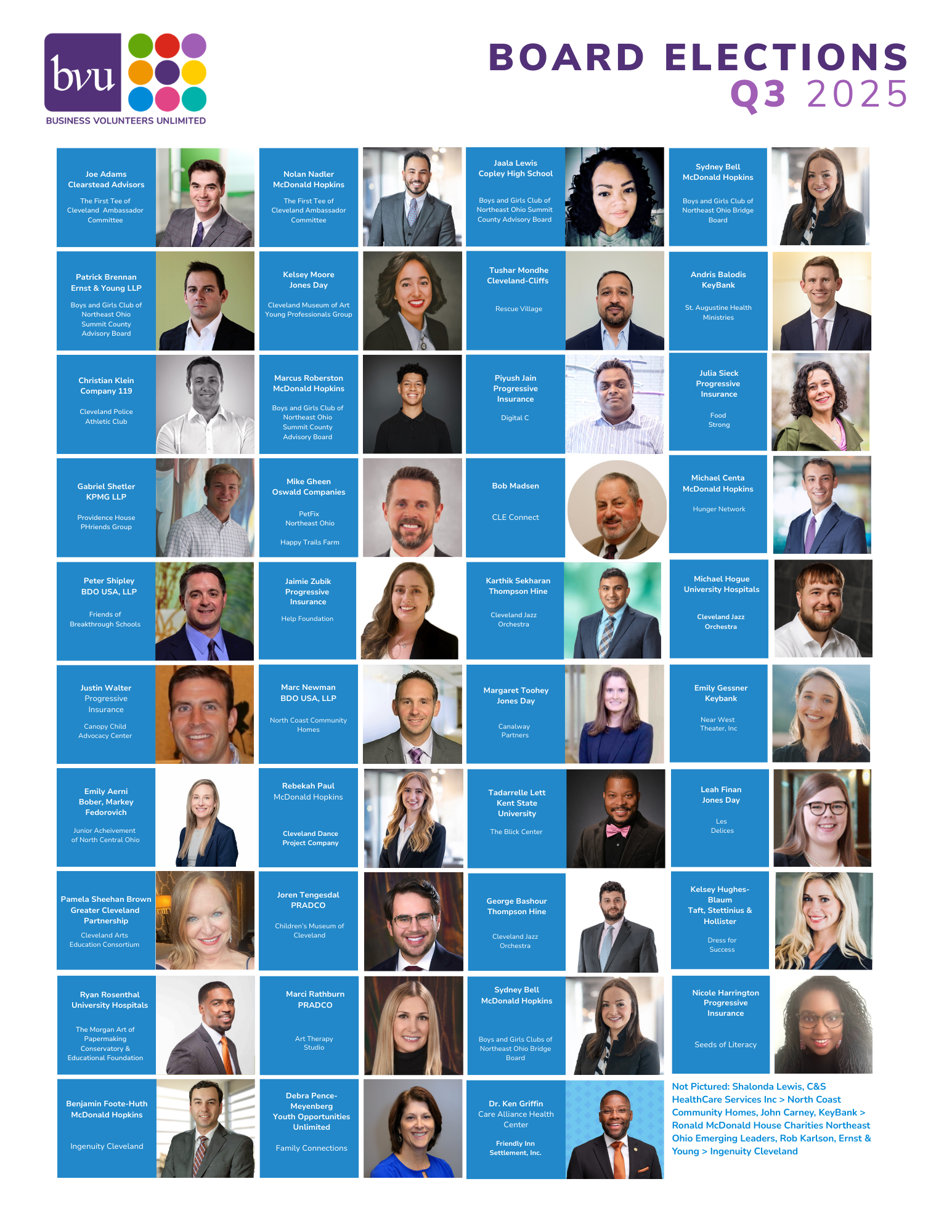 Emily Aerni, Bober Markey Fedorovich – Junior Achievement of North Central Ohio Ella Adams, Falls Communications – The Gathering Place Rising Leaders Council Joe Adams, Clearstead Advisors – The First Tee of Cleveland Ambassador Committee Mark Anderson, Summa Health – United Way of Greater Cleveland Young Professionals Board Nick Ashdown, Sherwin-Williams – Ohio City Bicycle Co-op Zakiyyah N. Ashshaheed, FirstEnergy – Euclid Hunger Center Christian Athey, First Financial Bank – Welcome House, Inc. Mallika Atreyapurapu, Progressive Insurance – RePlay for Kids Ashley Bailes, Thompson Hine LLP – Boys & Girls Clubs of Northeast Ohio Bridge Board; A Place 4 Me Andris Balodis, KeyBank – The Centers Associate Board; St. Augustine Health Ministries Ruth Barnum, Apex Skin – Embracing Futures George Bashour, Thompson Hine – Cleveland Jazz Orchestra Jana Bazzoli, University Hospitals – Arts Impact Sydney Bell, McDonald Hopkins – Boys & Girls Clubs of Northeast Ohio Bridge Board Sandy Blum – WomenSafe Inc. Katie Brancato, Case Western Reserve University – FrontLine Service Jim Brennan, Squire Patton Boggs – Reach Success Patrick Brennan, Ernst & Young LLP – Boys & Girls Clubs of Northeast Ohio Summit County Advisory Board Pamela Sheehan Brown, Greater Cleveland Partnership – Cleveland Arts Education Consortium Alissa Campbell Shaw, Sherwin-Williams – Tri-C Advanced Technology Training Center Hélène Caniac, Helene Can Help LLC – Zygote Press; Fair Housing Center John Carney, KeyBank – Ronald McDonald House Charities NEO Engaging Leaders Mary Carpenter, Progressive Insurance – WomenSafe Inc. Michael Centa, McDonald Hopkins – Hunger Network of Greater Cleveland Christopher Church, Progressive Insurance – Tri-C Business Industry and Leadership Team Andrew Cleves, Frantz Ward LLP – CASA of Cuyahoga County Lauri Cole, Progressive Insurance – One Health Organization Meredith Collier, Calfee, Halter & Griswold LLP – Board Champion Committee Brett Connolly, Shook Construction – Junior Achievement of Greater Cleveland Kendra Daniel, Lutheran Metropolitan Ministry – Hospice of the Western Reserve Luke Davis, McDonald Hopkins – Hope for a Cure for ALZ Amanda Delaney, KPMG LLP – Pathway Caring for Children Associate Board Sharee Dorsey, Cleveland Clinic – Tri-C Opportunities in Tech BILT; Art Therapy Studio Felisa Eafford, Cuyahoga Community College – Hunger Network Walk Committee Sam Eartly, CBIZ – Junior Achievement Young Professionals Advisory Board Albert Ferreria, MetroHealth System – MetroWest Community Development Organization Kelsey Finucan, Oswald Companies – Wigs for Kids Benjamin Foote-Huth, McDonald Hopkins – Ingenuity Cleveland Jennifer Forcier, Welty – NEOSEF Madeline Frantz, Greater Cleveland Partnership – Slavic Village Development Corporation Josh Friedman, Frantz Ward LLP – Cleveland Arts Education Consortium Emily Gessner, KeyBank – Near West Theatre Mike Gheen, Oswald Companies – PetFix Northeast Ohio; Happy Trails Farm Logan Gresock, Welty – ACE Mentor Program of Cleveland Dr. Ken Griffin, Care Alliance – Friendly Inn Settlement
