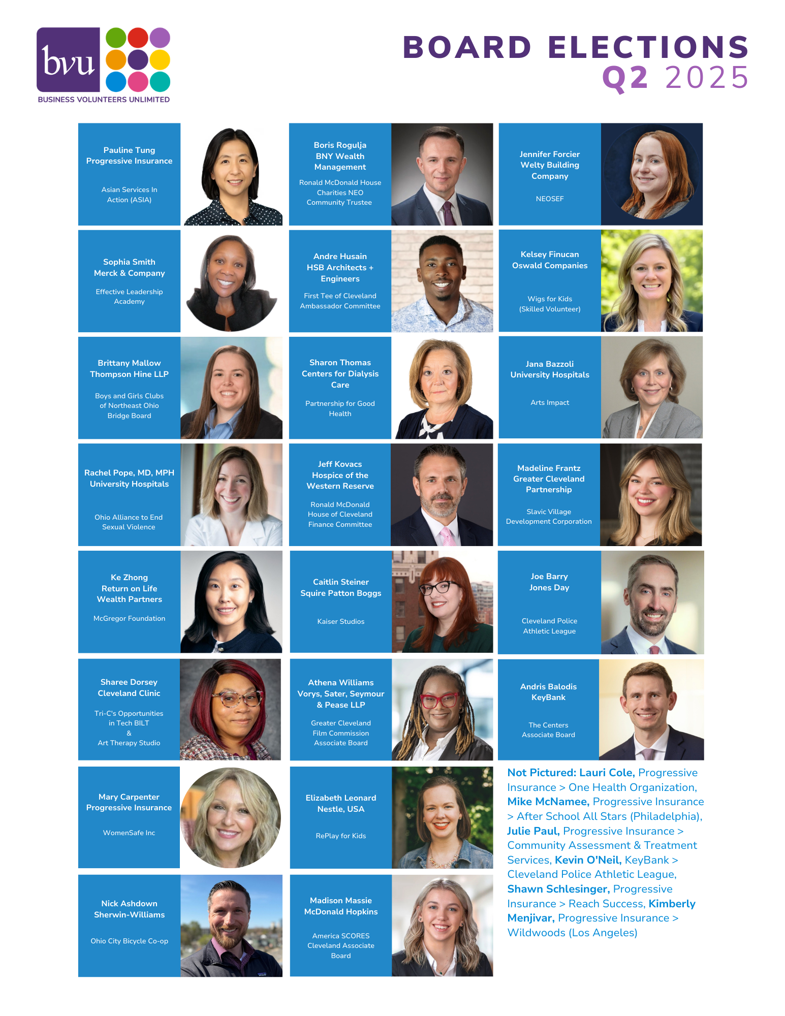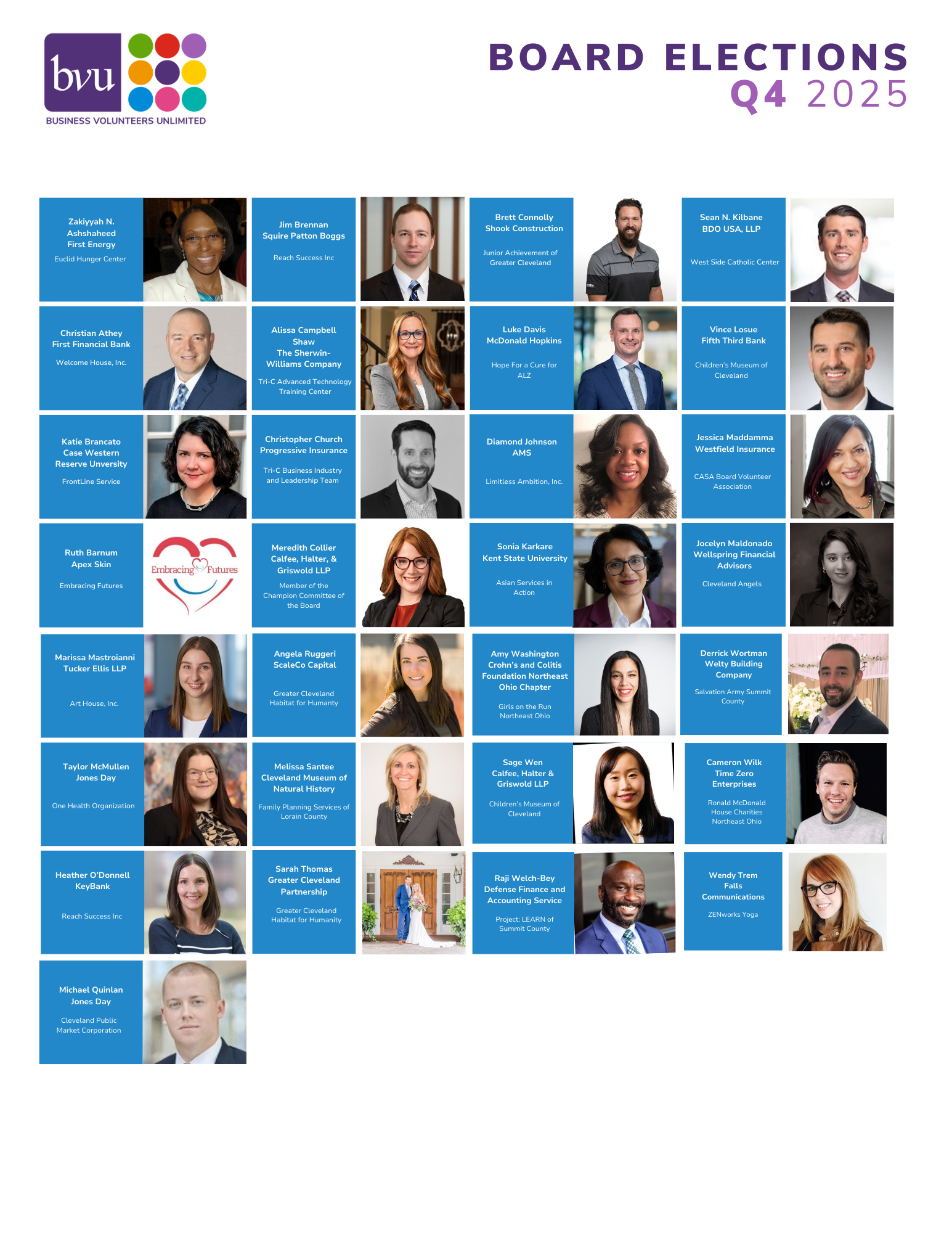Business Volunteers Unlimited (BVU) proudly announces the Board Matching Class of 2025, a cohort of more than 130 business professionals who have been trained, matched, and elected to nonprofit boards and committees across our region and beyond. BVU’s Board Matching Program, now in its fourth decade, has matched a total of more than 4,300 professionals to nonprofit board service – creating a robust network of civic-minded leaders shaping Northeast Ohio’s future. The Class of 2025 represents the continued commitment of our business community to support and engage in civic service across the region.